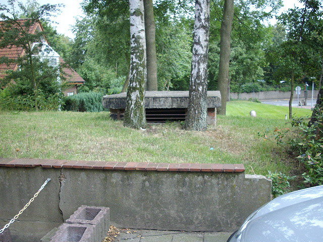 Der Standort einer mittlerweile entfernten Splitterschutzzelle an der Ecke Am Kirchenkamp / Katharinenstraße (heute Ernst-Sievers-Straße) konnte ausfindig gemacht werden. Vielen Dank an die Anwohnerin für den Tipp! Hier Ein weiterer LS-Stollen konnte wiederum durch einen Anwohner nachgewiesen werden: Es handelt sich um eine Anlage unter der Berningshöhe. Der Stollen selbst ist noch vorhanden, der Eingang wurde zugeschüttet. Hier Noch heute sind die ehemaligen äußeren Verbunkerungen eines LS-Kellers Am Kirchenkamp in Gestalt von mehreren Kellerfensterschutzblöcken aus Beton vorhanden. Sie besitzen normiert zwei Griffmulden und Aussparungen, die auch als Sichtscharten gedient haben. Die Blöcke wurden nach dem Krieg zu einer Treppe umfunktioniert. Diese Schutzblöcke wurden reichsweit normiert hergestellt. In Wilhelmshaven beispielsweise sind die Blöcke im Krieg in großen Mengen vor den Fenstern der LS-Keller vorhanden gewesen. Hier Ein Foto des Standortes vom Deckungsgraben Am Kirchenkamp konnte eingefügt werden. Der große öffentliche Schutzgraben wurde nach dem Krieg entfernt. Ob noch Reste unter Erdgleiche vorhanden sind, ist bis dato unklar. Hier