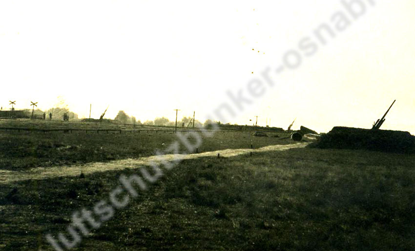 Eine seltene historische Fotoaufnahme aus dem Bereich der ehemaligen Flakstellung auf dem Lammersbrink nahe dem Varusturm bei Georgsmarienhütte wurde eingefügt. Die Stellung war zusammen mit mehreren anderen Flakstellungen für den Schutz des kriegswichtigen Georgsmarienhütte zuständig. Die Aufnahme aus frühen Kriegstagen zeigt einen hölzernen Flakturm der Stellung. Dieser Turm wurde höchstwahrscheinlich auf einem verbunkerten Betonfundament gebaut, welches standardisiert realisiert wurde und durch seine Form auch als "Flakstern" bezeichnet wird. Derartige Fundamente sind im gesamten Osnabrücker Umkreis noch heute vermehrt anzufinden. Auch im Bereich der ehemaligen Flakstellung auf dem Lammersbrink sind gesprengte Reste der "Flaksterne" noch heute erkennbar. Vielen Dank für die freundliche Bereitstellung der Aufnahme an Herrn Beermann! Hier