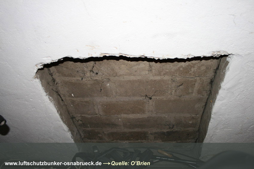 Einfacher, äußerlich nicht sichtbar verbunkerter LS-Keller im Stadtteil Wüste in Osnabrück (in Tabelle nicht aufgelistet). Interessant sind wieder die Steigeisen am Notausstieg und die Türen aus Massivholz. Betontrümmer im Freien am Keller könnten Reste von Stahlbeton-Schutzblenden der Fenster darstellen. Auch ein Pfeil ist noch an der Gebäudewand zu sehen. Erhalten